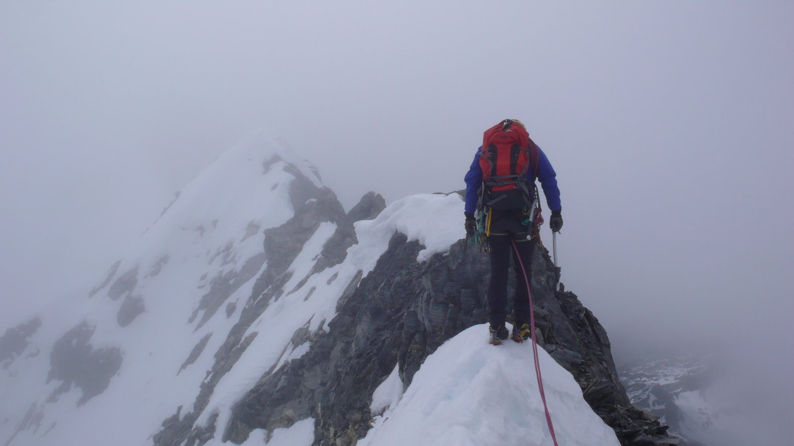 Es folgt leichte Kraxelei, die auf verschiedenen Wegen am ersten Firnfeld endet (auf unserer Variante Stellen II). Die nächsten ca. 200 m kann man (zur Zeit) in 50° steilem Firn durch den Fels manövrieren… das ändert sich sicher bald. Man kommt auf ein kurzes Stück Felsgrat, das zum zweiten Eisfeld führt. Dieses ca. 300 m, bis 55° steil und etwas felsdurchsetzt zum Vorgipfel hinauf. Von diesem geht es ausgesetzt immer direkt am Grat entlang, zuerst in schönem luftigen Fels (Stellen II – III), dann über eine gebohrte Abseilstelle (die wir auch benutzt haben, sonst ca. IV abkletternd), nochmals im Fels und schließlich im Firn mit teils steilen, sehr ausgesetzten, aber momentan gut zu gehenden Passagen zum Gipfel.