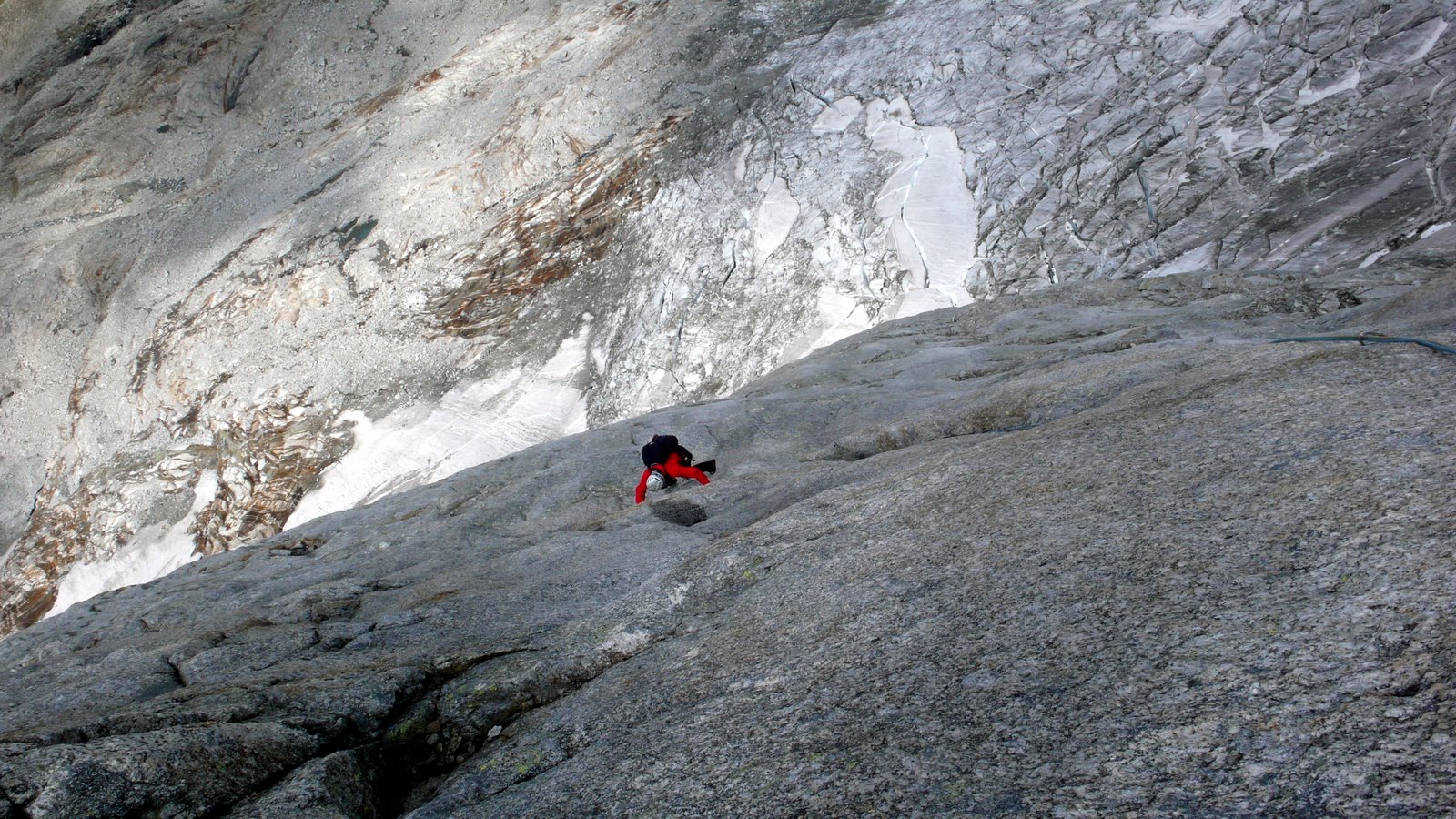 Der Übergang vom Eis in den Fels ist momentan kein Problem. Beim Zustieg müssen auf dem Gletscher allerdings ein paar gewaltige Spalten umschifft werden… eine sehr feine Schneebrücke vermittelt adrenalinfördernd den Übergang über die letzte große Querspalte. Diese muss man wohl bald großräumig im Aufstiegssinn links umgehen.