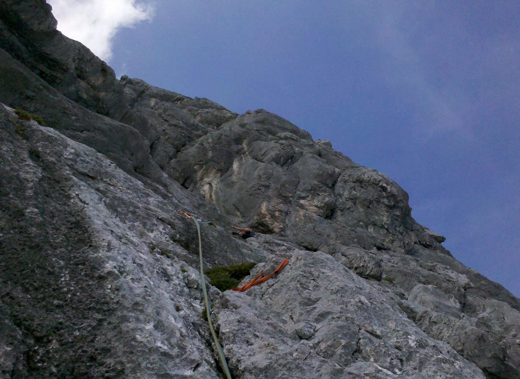 Breitenkopf Nordwestsockel “Tris”: Schwere Stellen gut gesichert, sonst weite Abstände.