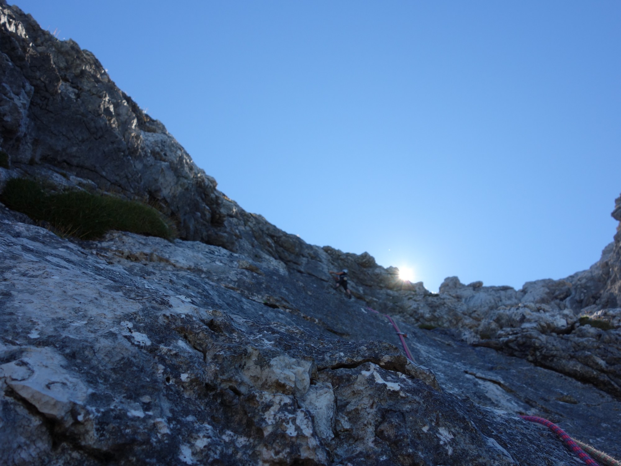 Unterwegs ist noch der Erstbegeher Daniel zusammen mit Hias nach einem netten Plausch an uns vorbeigerauscht. Wir machten erst die 8. Begehung… Topo und Infos gibt es hier: http://www.bergheimat.net/2009/09/weg-zur-sonne-hirschbichlkopf.html