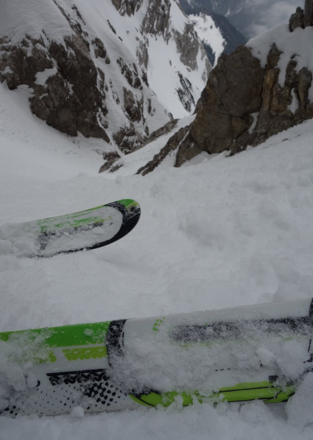 Von der Schwärzscharte seilt man zwei mal in die Rinne ab, dann geht es durchgehend mit Ski dahin. In der Scharte ist der erste Abseilstand direkt in der Mitte an einem Felsblock. Alternativ – vermutlich bei hoher Schneelage dann der einzig erreichbare Stand – links im Fels etwas weiter oben. Ein 60m-Seil reicht: der erste Abseiler ist ca. 25 m, der Stand ist am Abschluss der schmalen Rinne rechts. Dann noch einmal 30 m abseilen, bissl rechts halten, dann reichts bei der momentanen Schneelage und meinem Landepunkt ums A****lecken, da lohnt sich mal der Winterspeck. Hab dann später entdeckt, dass es im Abseilsinn rechts Richtung Verschneidung noch einen Stand hat, den man bei weniger Schnee wohl durchaus für einen weiteren Abseiler gebrauchen kann!